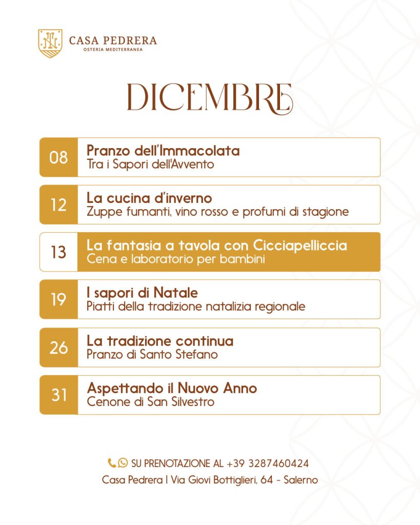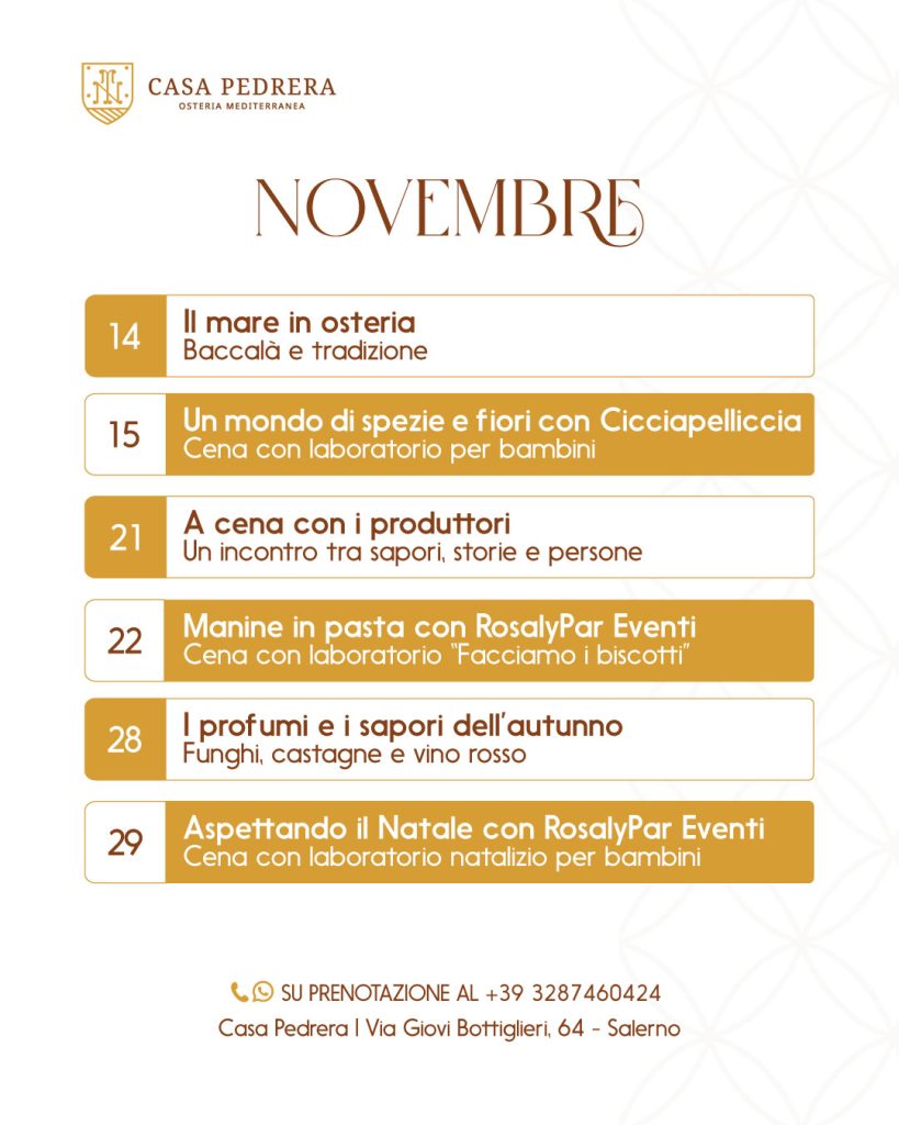 Nella nostra osteria mediterranea Casa Pedrera, nel cuore del parco della Tenuta, nei mesi di novembre e dicembre vi aspetta un calendario di eventi all’insegna del gusto e del divertimento: